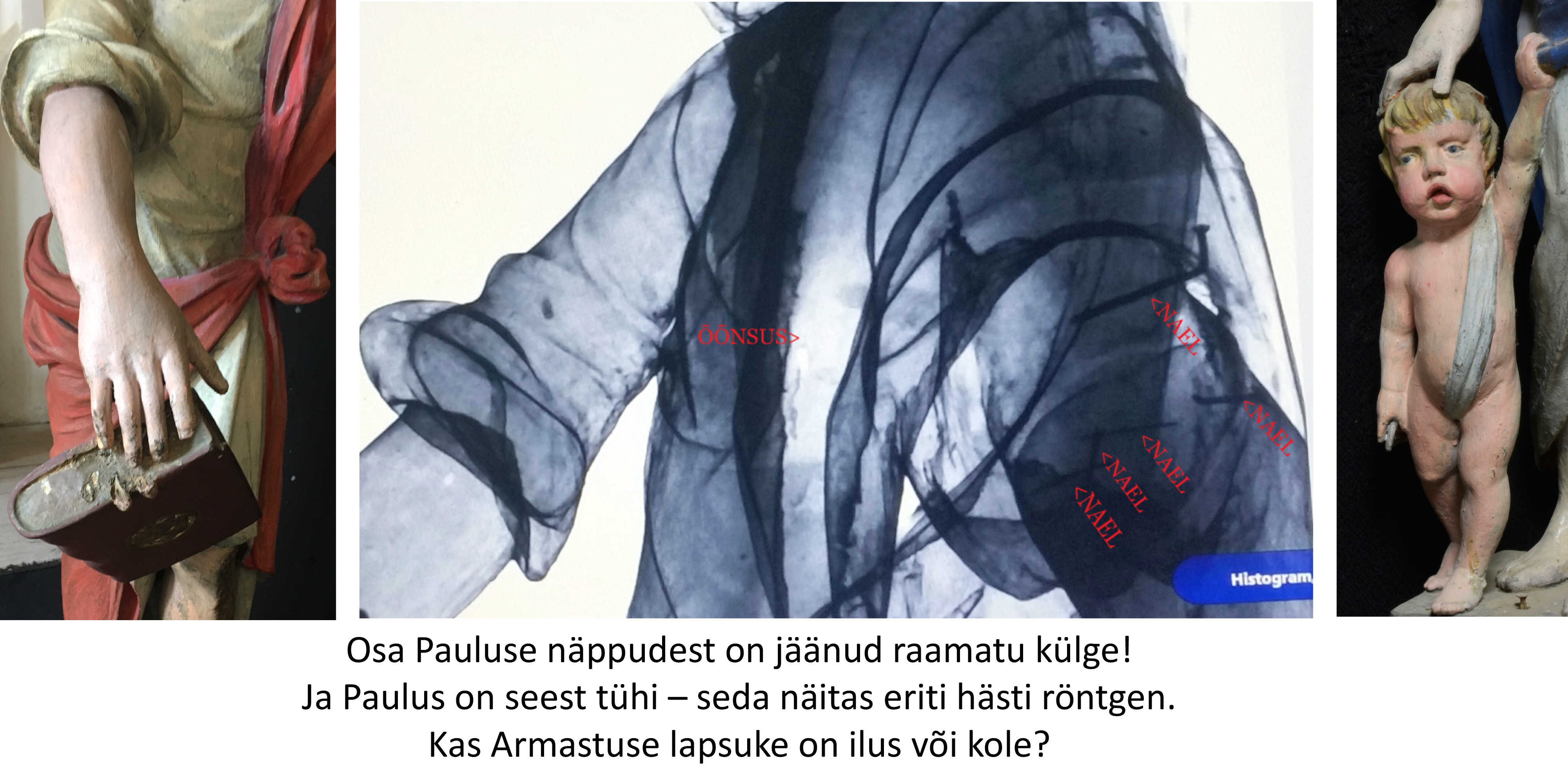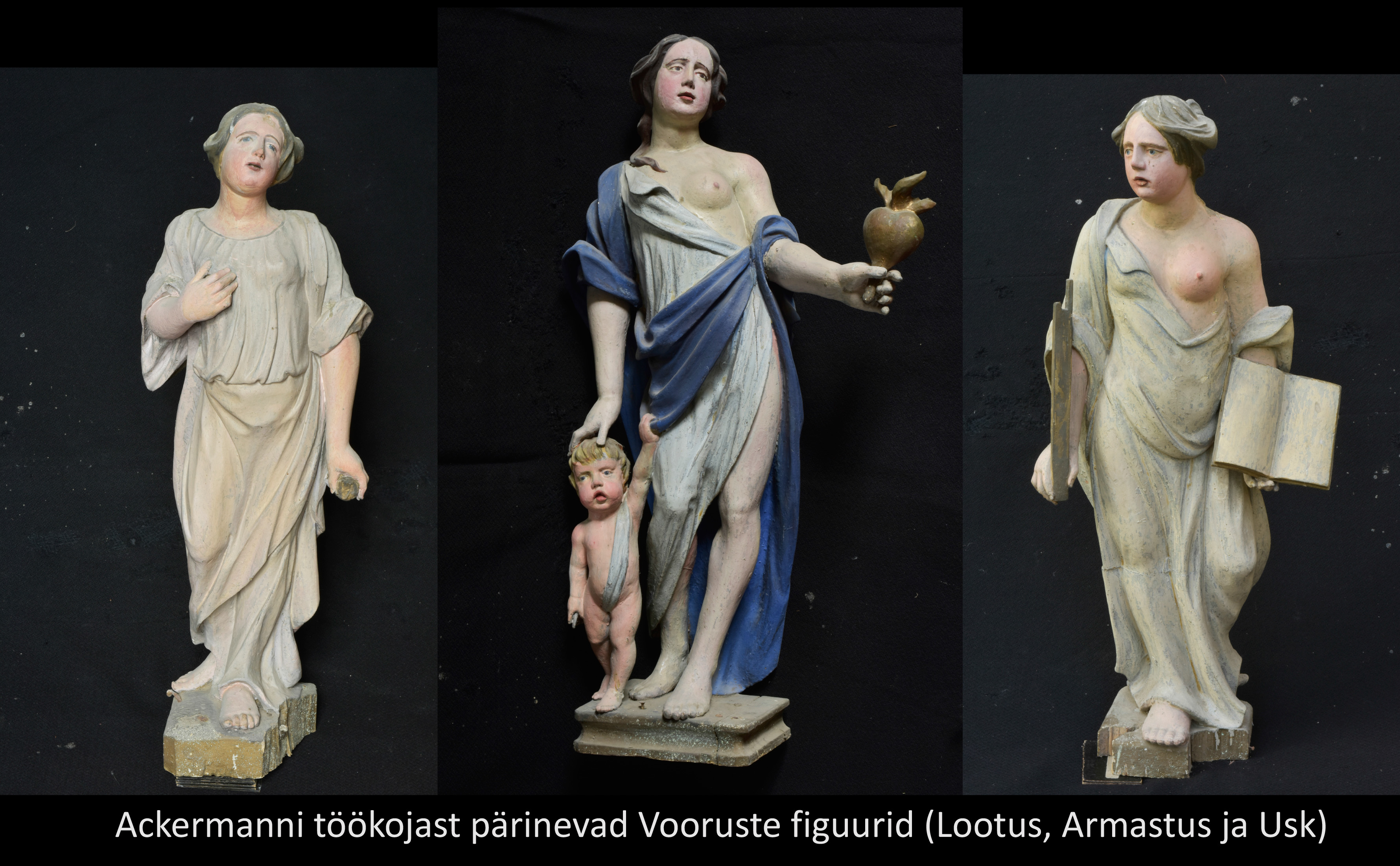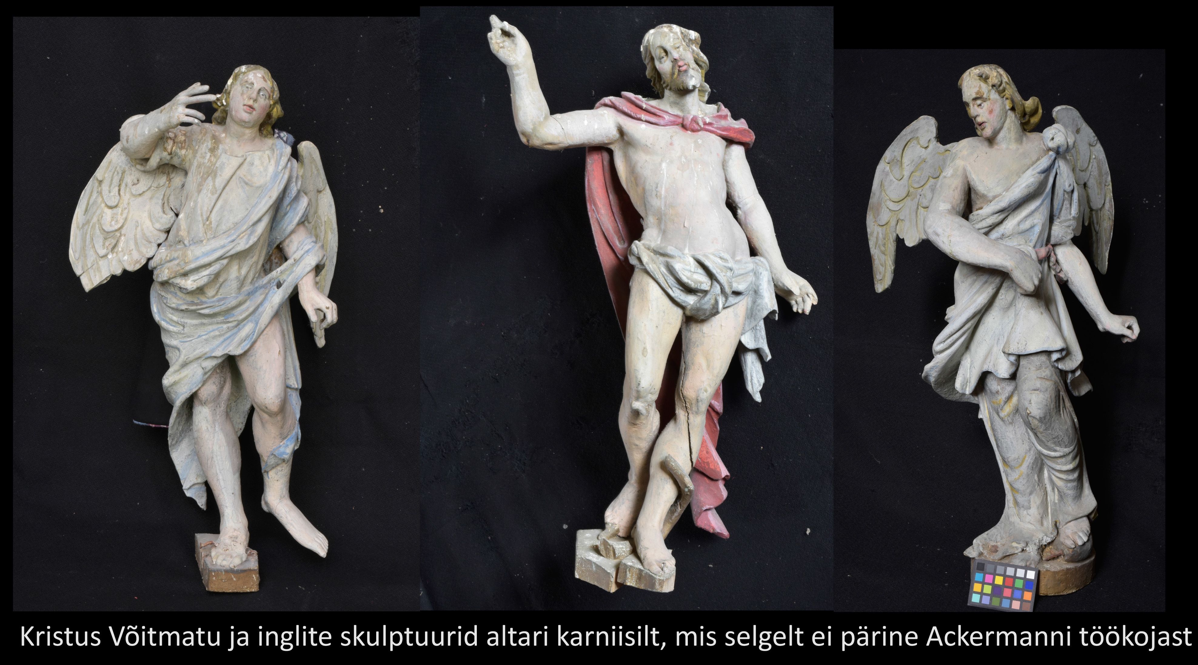 Kuigi labaoriuuringud Simunas võetud värvi- ja puiduproovide põhjal veel jätkuvad, võib juba täna öelda: altariseina kolm karniisifiguuri – kaks inglit ja Kristus Võitmatu kuju on pärit nn Teise meistri töökojast. Niivõrd erineb nende nikerdustiil ja ülesehitus Ackermanni töökojas valmistatud kujudest. Võimalik, et inglite ja Kristuse kuju pärinevad mõnest lähikonna kirikust (ehk nt Haljast või Kadrinast, kust 19. sajandil vana altarisein neogooti stiilis uue retaabli vastu välja vahetati). Või teine variant – Ackermann sai kujud kusagilt/kelleltki ning pidi need altariseina juures ära kasutama (figuuride arvust sõltus retaabli lõpphind). Viimast versiooni ei toeta asjaolu, et altari korpuse ehitusliku struktuuriga need ei sobitu ja skulptuuride paigutus altarile on juhuslikku laadi.