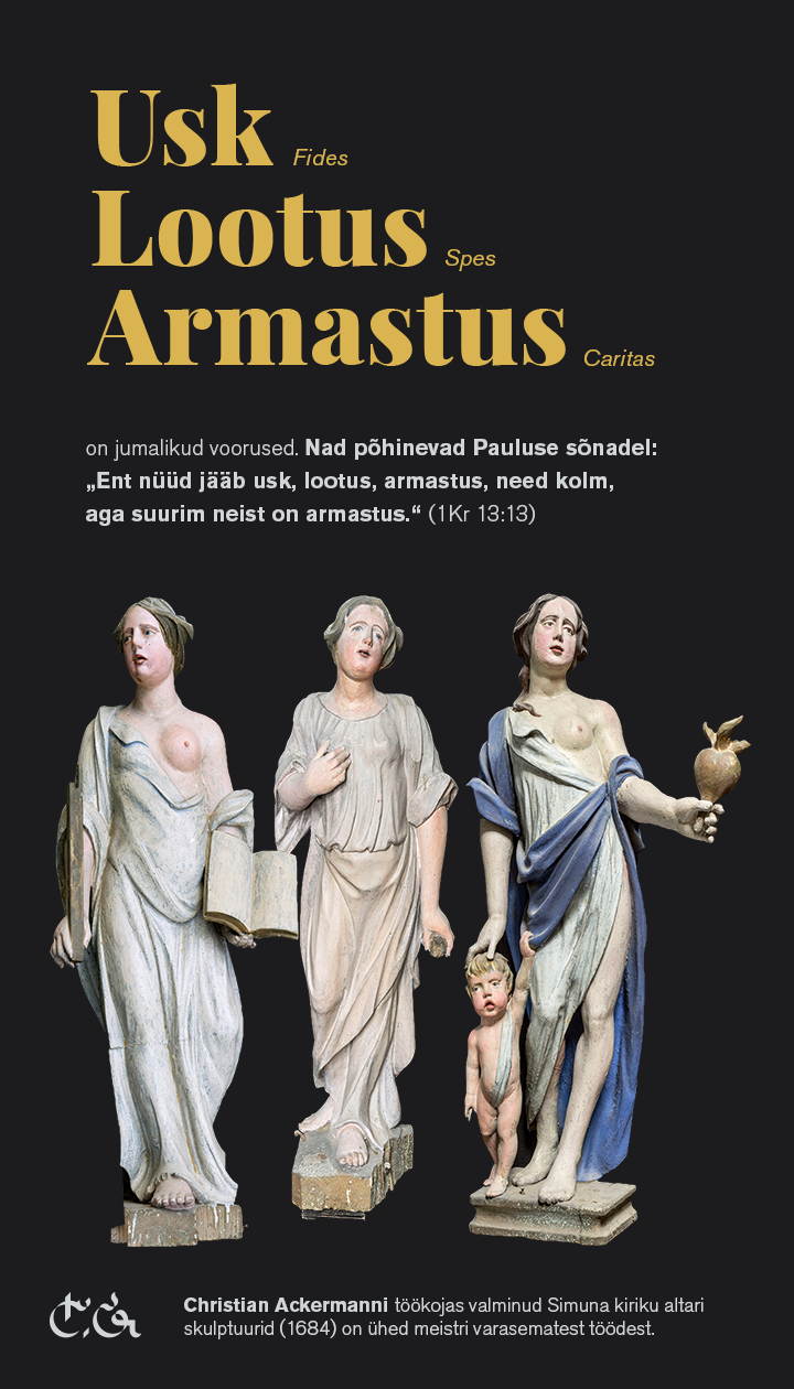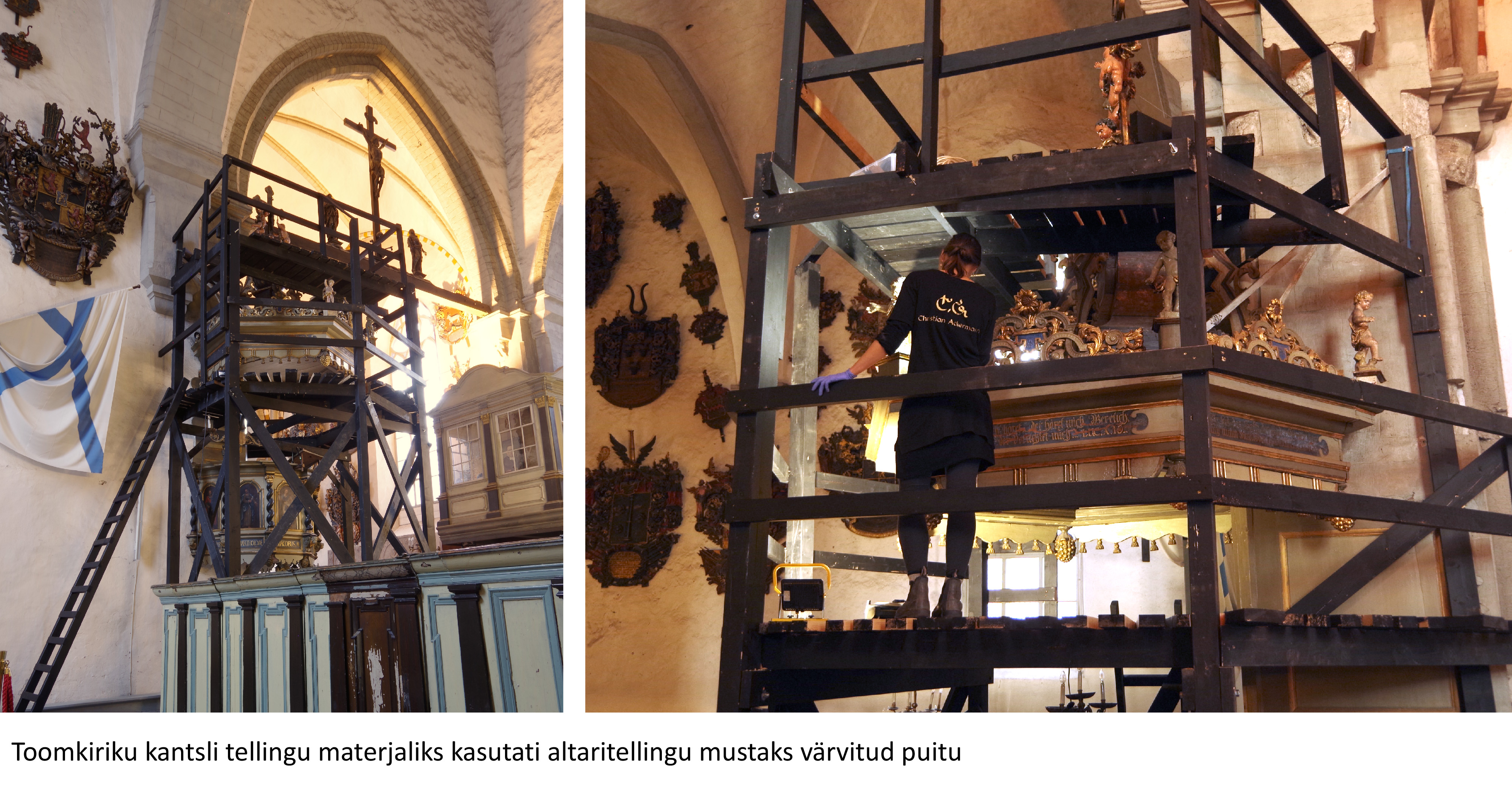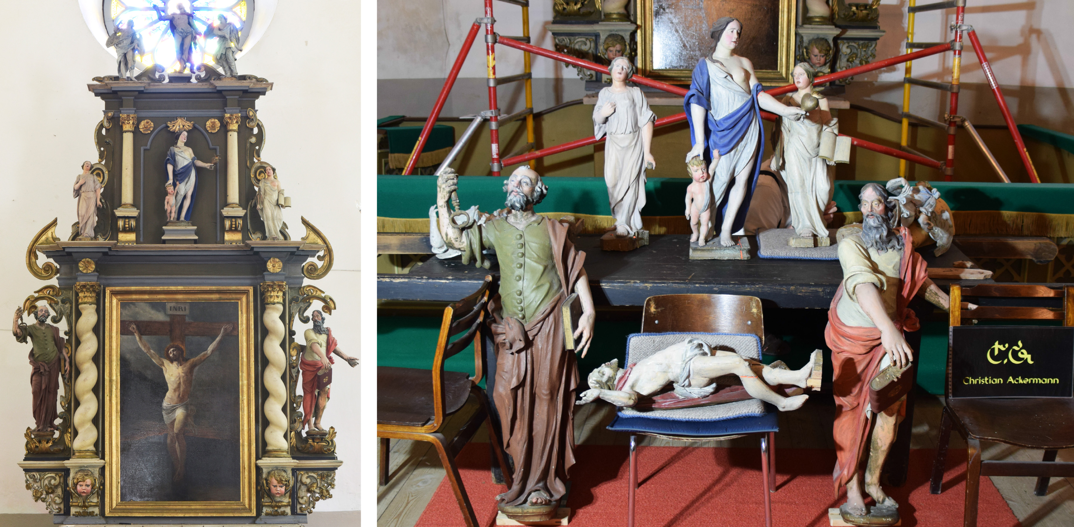 Kuigi labaoriuuringud Simunas võetud värvi- ja puiduproovide põhjal veel jätkuvad, võib juba täna öelda: altariseina kolm karniisifiguuri – kaks inglit ja Kristus Võitmatu kuju on pärit nn Teise meistri töökojast. Niivõrd erineb nende nikerdustiil ja ülesehitus Ackermanni töökojas valmistatud kujudest. Võimalik, et inglite ja Kristuse kuju pärinevad mõnest lähikonna kirikust (ehk nt Haljast või Kadrinast, kust 19. sajandil vana altarisein neogooti stiilis uue retaabli vastu välja vahetati). Või teine variant – Ackermann sai kujud kusagilt/kelleltki ning pidi need altariseina juures ära kasutama (figuuride arvust sõltus retaabli lõpphind). Viimast versiooni ei toeta asjaolu, et altari korpuse ehitusliku struktuuriga need ei sobitu ja skulptuuride paigutus altarile on juhuslikku laadi.