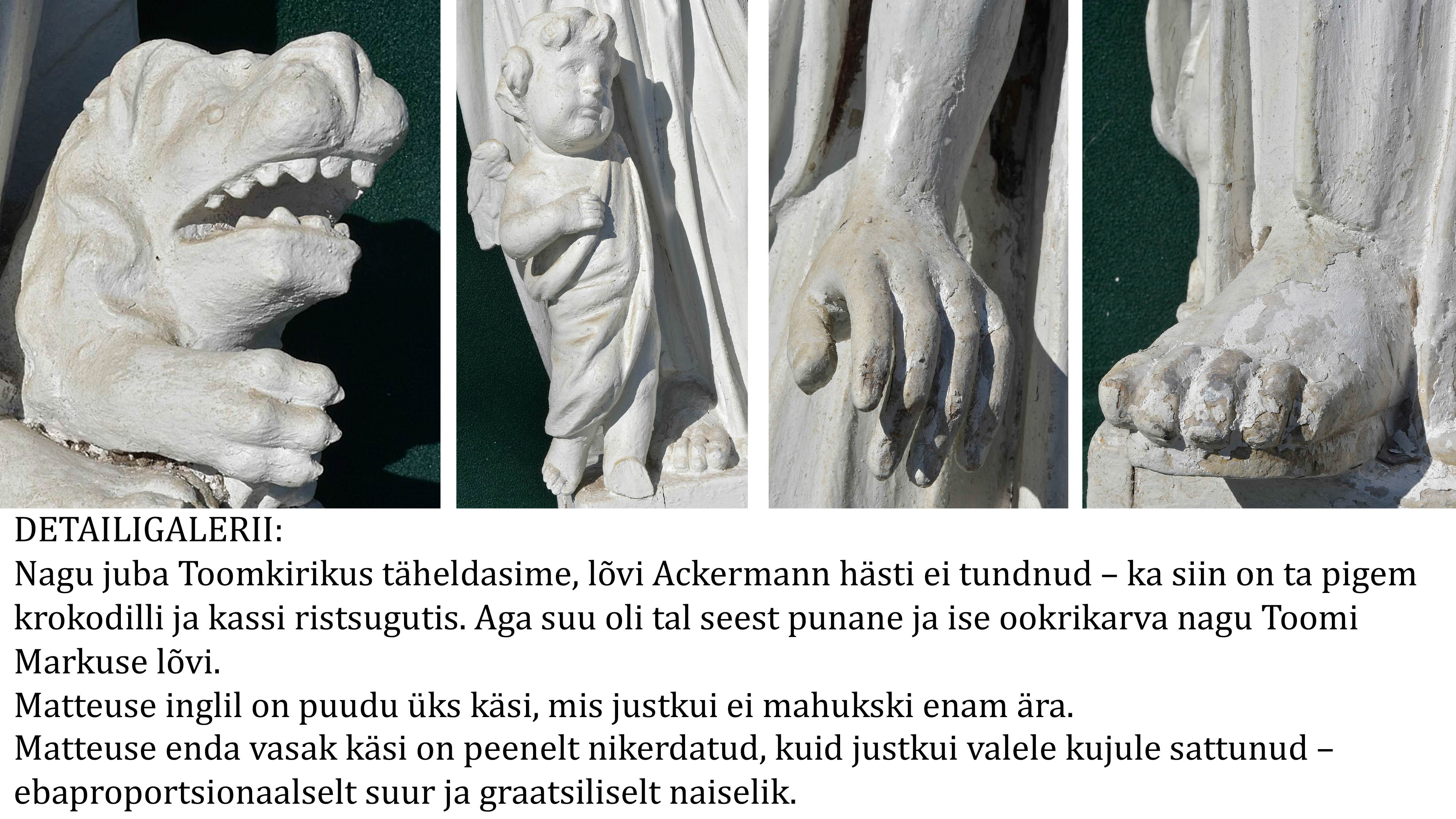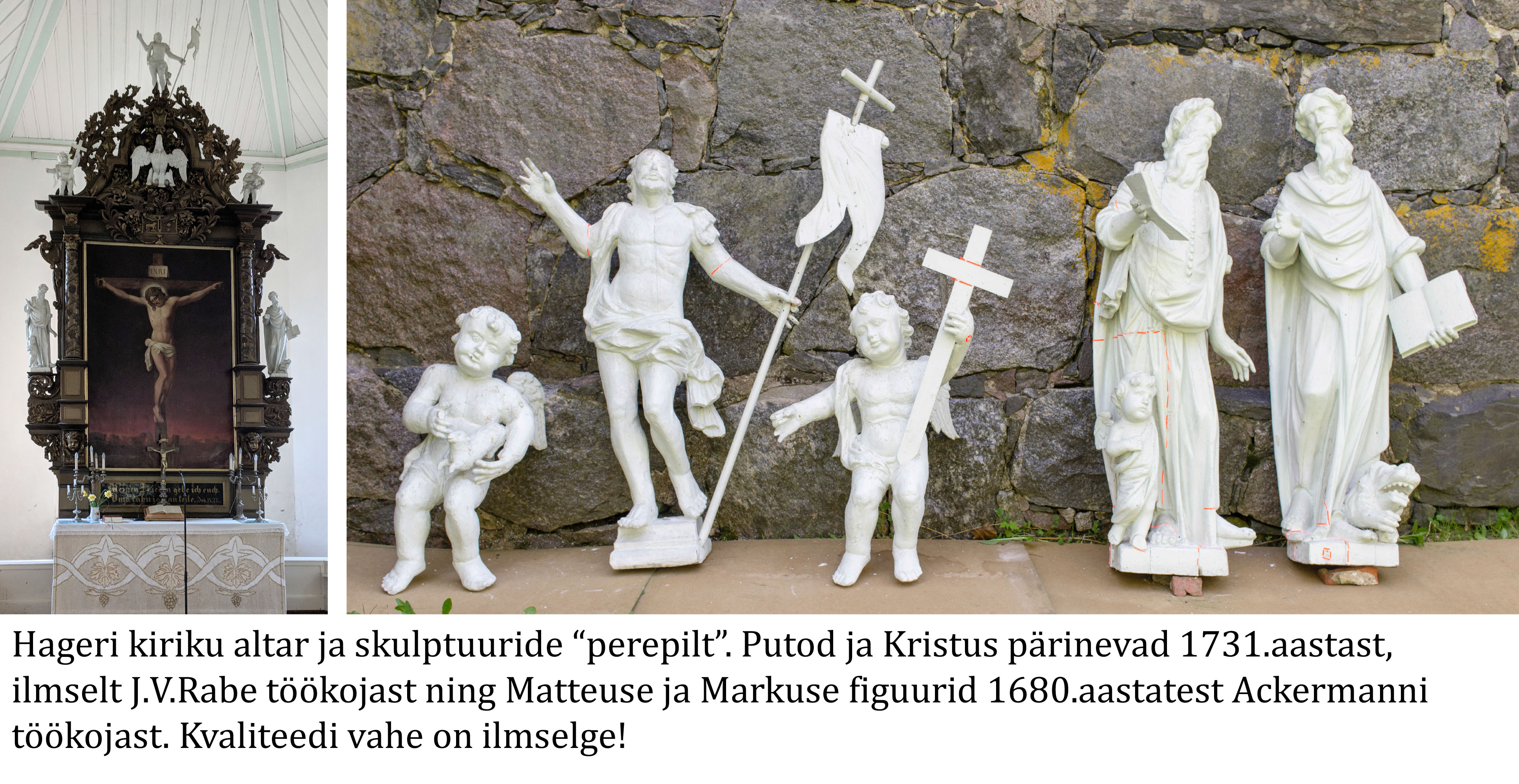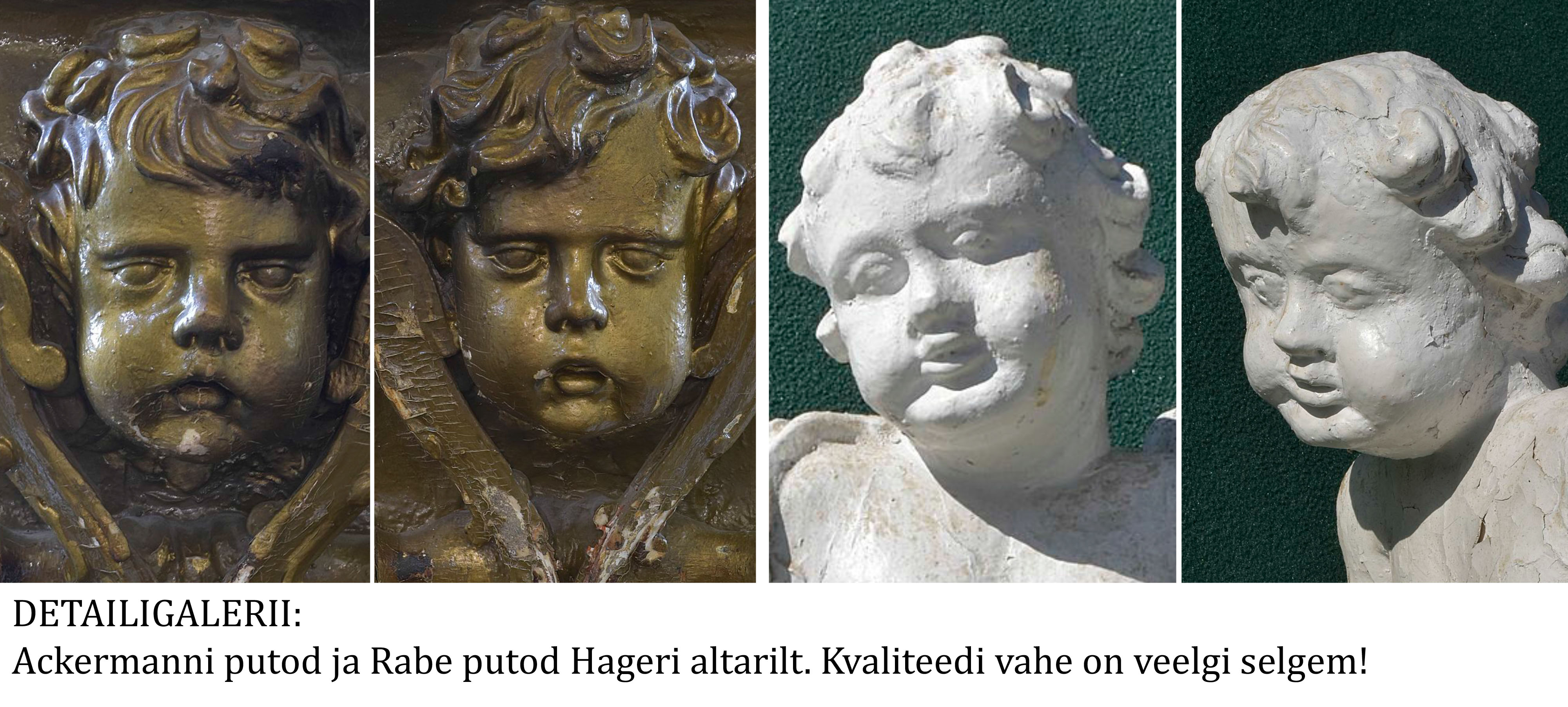 Altariseina figuuride lähivaatluse ja röntgenpiltide analüüsi tulemusel kujunes töögrupil arvamus, et mängus on olnud kolme meistri käed. Sten Karlingi poolt 20.sajandi alguses Rabele omistatud figuurid – Kristus Kõigevõitja, pelikan poegadega ja kaks karniisi inglit – eristuvad selgelt Ackermanni töökojas tehtutest – nende tüpaaž ja nikerduskvaliteet on silmatorkavalt erinevad, aga ka märksa nõrgemad. Kindlalt pärinevad Ackermanni käe alt altariseina putokonsoolid, samal ajal kui Matteuse ja Markuse nikerdamise omistamist meistrile endale tekitab mõningaid kahtlusi. Üheltpoolt jälgivad kujud küll hoolikalt Ackermanni skulptuuridele iseloomulikke jooni detailideni, teisalt aga iseloomustab neid mingi iseäralik tuimus ja pealiskaudsus. Nii näiteks tundub vähetõenäoline, et Ackermann oleks kujutanud mõnd figuuri seismas oma rüü alaserval, nagu Hageris evangelist Matteus, või jätnud üle figuuri aluse (postamendi) ulatuva päka altpoolt anatoomiliselt välja nikerdamata, nagu Hageris evangelist Markuse puhul). Lisaks pakub Matteuse kahe käe võrdlus tuge oletusele, et mängus on veel üks nikerdaja, näiteks Ackermanni abiline: Matteuse tahuline-kandiline raamatut hoidev käsi erineb selgelt voolujoonelisest-peenelt nikerdatud teisest käest. Selle erinev stiil ja kuju suhtes liiga suured mõõtmed viivad mõtteni, et Matteuse ilus käsi on algselt olnud mõeldud mõnele teisele kujule, eeldatavalt naisfiguurile: Ackermanni meesfiguuride käsivarte puhul on reeglina märgatav meistri soov jälgida meeste anatoomiat, voolida välja lihased ja paisunud veresooned. Ei saa välistada, et Matteuse ilus naiselik käsi on lihtsalt võetud Ackermanni töökoja riiulilt, kus hoiti tulevaste kiirete tellimuste jaoks n-ö ettevalmistatud detaile.