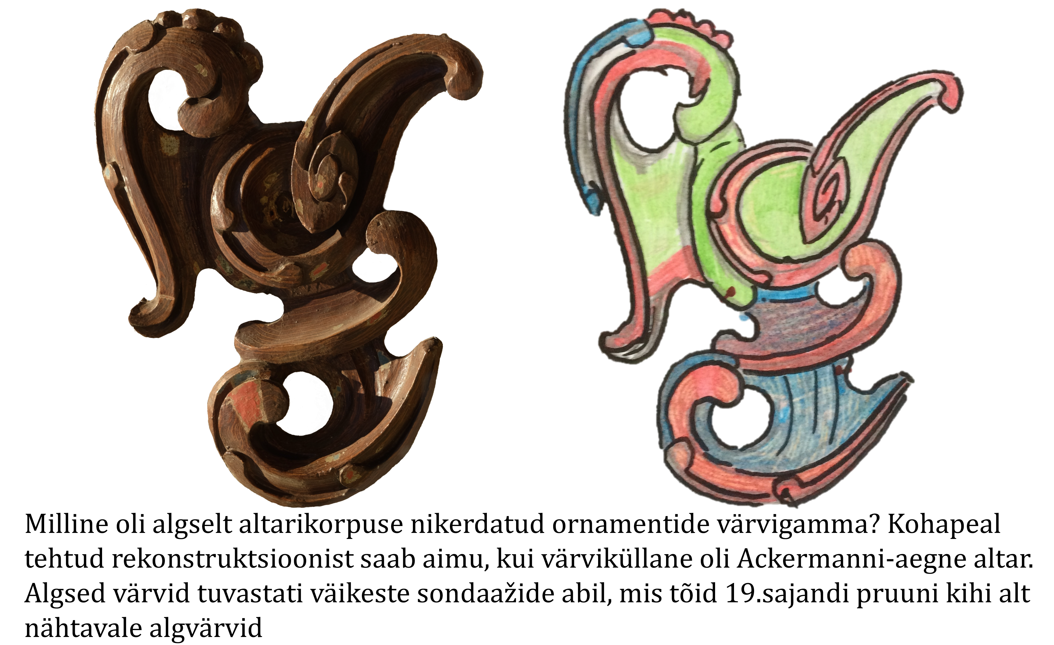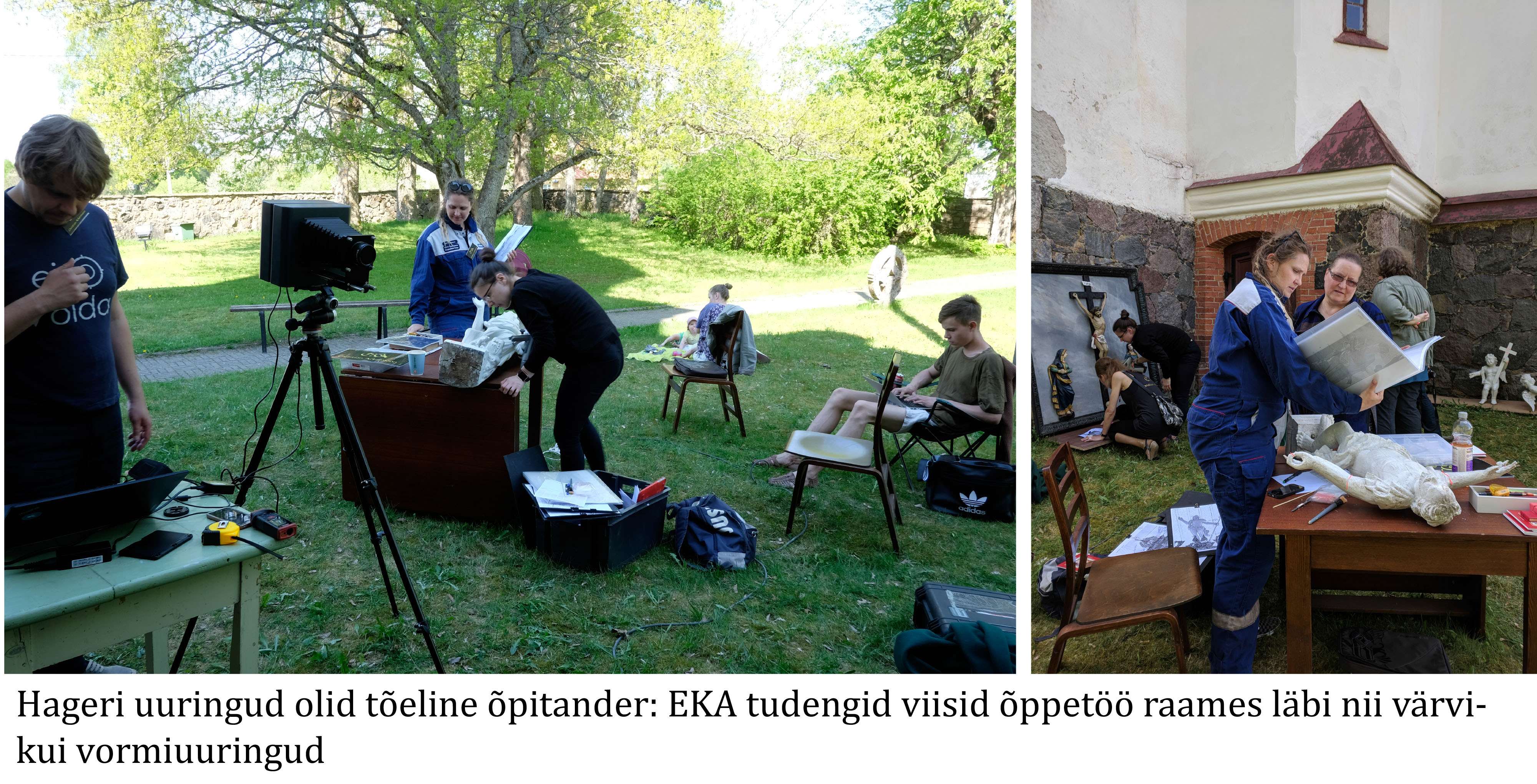 Seda kõike teadsime juba enne, ja ka seda, et 19. sajandil valgeks värvitud Ackermanni ja Rabe figuurid on algselt olnud polükroomsed (eelmise aasta uuringud Karuse, Martna, Türi, Tallinna toomkirikus ja Rootsi-Mihkli kirikus andsid selleks alust). Hageris tehtud värviuuringud kinnitasid seda, aga pakkusid ka rea üllatusi: mujal oleme leidnud kuldsete või hõbedaste tiibadega ingleid, kuid Hageri altariseinal on nii hilisematel kui Matteuse inglil helesinised tiivad; mujal oleme näinud ikka Kristus Kõigevõitja kujul kuldset niuderätti, Hageris katab Kristuse alakeha (ja sedagi ainult eestpoolt) kinaverpunane draperii! Omamoodi üllatav oli ka evangelist Matteuse rüü, mis oli sinine ja kuldsete kantidega ning Markuse oma, mis kaetud punase ja rohelise lüstriga. Kahe evangelisti nii erinev värvilahendus viib mõttele, et kujudel pidid olema analoogse värvilahendusega paarikud, mida eeldaks ka altariseina üldine ikonograafiline programm – kahe evangelisti väljavalimine neljast ei ole põhjendatud.